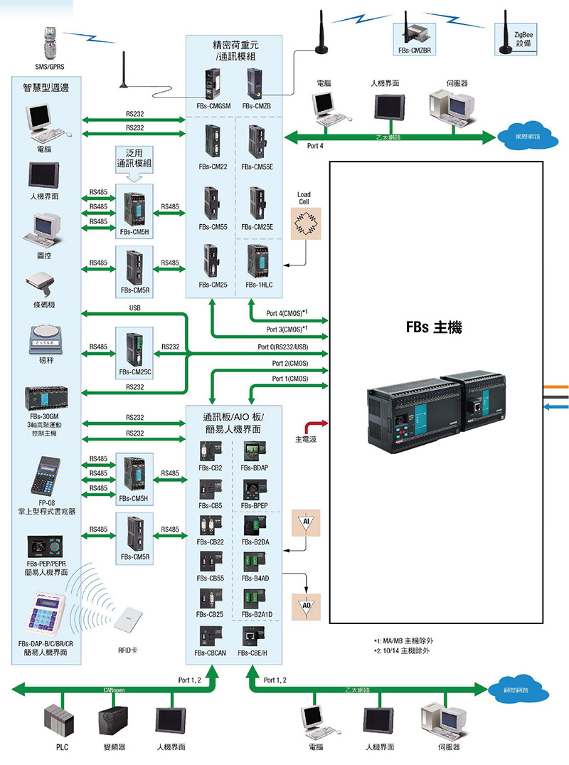 FBs-PLC之5个通讯埠可同时连结各种智慧型周边,界面则有USB、RS232、RS485、乙太网路 (Ethernet)、CANopen®、GSM、ZigBee™ 等可供选择,除可选用永宏标准通讯协定或Modbus通讯协 定或透过FATEK Communication Server通讯伺服器来通讯外,尚可利用CLINK通讯便利指令,自行定 义通讯协定,主动或被动地与任何智慧型周边连线。此外FBs-PLC尚提供可多台连线之FBsDAP或FBs-PEP简易人机界面,除可当Timer/Counter设定器外,尚可由使 用者自行定义专用按键及讯息显示,当简易人机界面使用。同时FBs-DAP 或FBs-PEP亦可附加RFID感应模组,作诸如门禁、停车设备、电梯乘载管制 等应用。