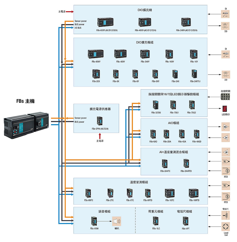 除涵盖基本之数位I/O、类比I/O及多种通讯界面外, 尚包括指拨开关多工输入模组、16/7段LED显示模组及J、K、R、S、E、T、B、 N等8种热电偶或Pt100、Pt1000两种RTD之温度量测模组,以及最新推出 的电子磅秤用之荷重元模组与位置量测用之电子尺模组以及可让FBs-PLC 更具人性化与亲和力之语音模组。
